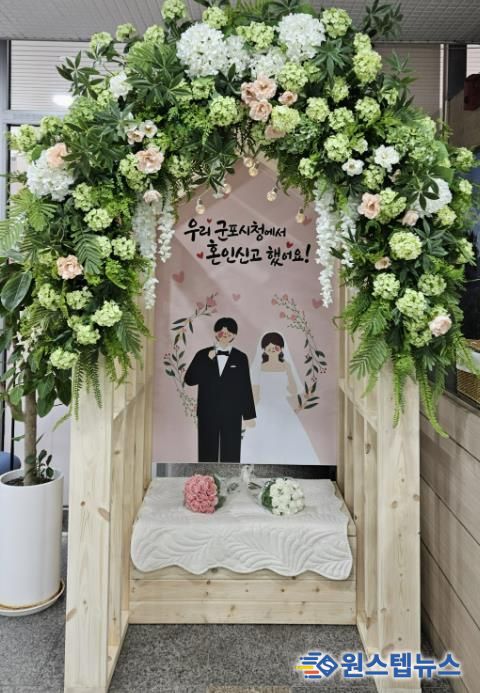 하은호 군포시장은 “혼인이라는 새로운 가정의 탄생을 축복하기 위해 꽃으로 어우러진 집 모양의 포토존을 민원실에 마련했다”며 “앞으로도 시민들의 행복한 순간에 특별함을 더하는 행정서비스를 제공하기 위해 노력하겠다“고 말했다.