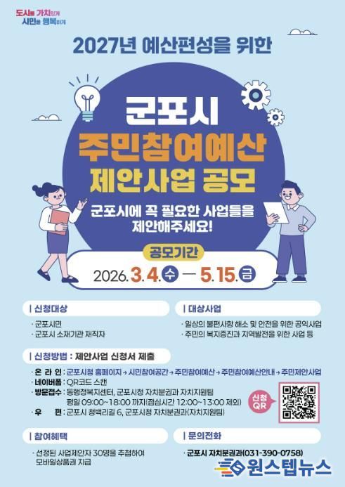 원스텝뉴스 이병희 기자 | 군포시는 3월 4일부터 5월 15일까지 ‘2027년 예산편성을 위한 주민참여예산 제안사업’을 공모한다.
