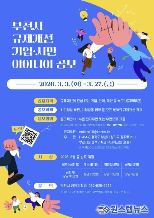 원스텝뉴스 이병희 기자 | 부천시는 3월 3일부터 3월 27일까지 25일간 ‘2026년 규제개선 기업·시민 아이디어 공모’를 추진한다. 이번 공모는 기업과 시민이 일상과 산업 현장에서 겪는 불합리한 규제를 발굴해 현장 중심의 실질적인 정책 개선으로 이어가기 위해 마련됐다.