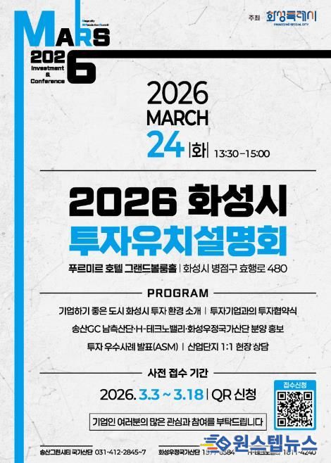 원스텝뉴스 이병희 기자 | 화성특례시가 오는 3월 24일 푸르미르 호텔에서 ‘2026 화성특례시 투자유치 설명회’를 개최하고, 3월 3일부터 3월 18일까지 QR코드를 통한 사전접수를 진행한다.
