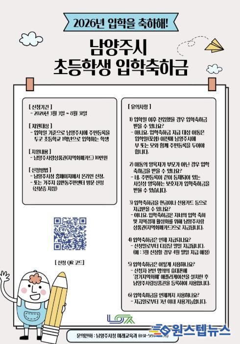 원스텝뉴스 이병희 기자 | 남양주시는 오는 3월부터 2026년 초등학교에 입학하는 아동의 새로운 출발을 응원하기 위해 입학축하금 지원 사업을 추진한다고 3일 밝혔다.