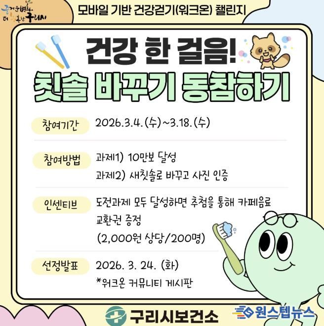 참여 방법은 ▲워크온 앱 설치 ▲구리시 공식 인터넷 동아리 ‘즐거운 걷기, 더 행복한 건강생활’ 가입 ▲참여 잇기 기간 10만 보 달성 ▲새 칫솔로 교체 후 사진 인증 순으로 진행된다. 구리 시민 누구나 참여할 수 있으며, 임무를 완료한 참가자 중 추첨을 통해 200명에게 모바일 음료 쿠폰을 제공할 예정이다.
