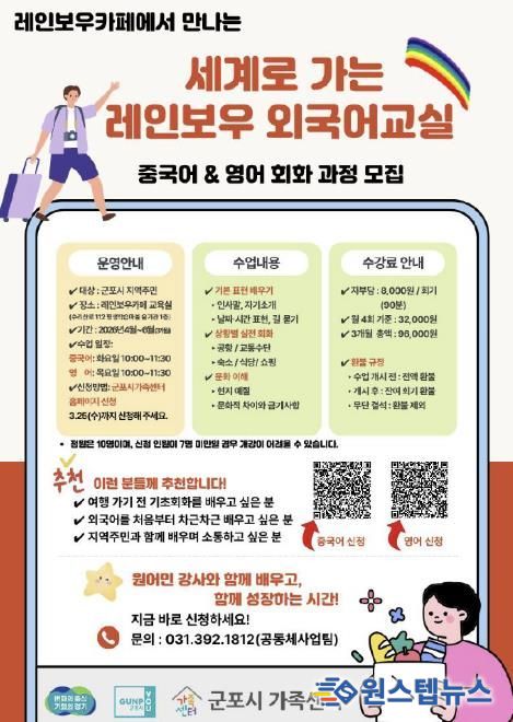 원스텝뉴스 이병희 기자 | 군포시가족센터는 군포시민을 위한 실생활 외국어 회화 프로그램 ‘세계로 가는 레인보우 외국어교실’을 오는 4월부터 레인보우카페 교육실에서 운영한다.