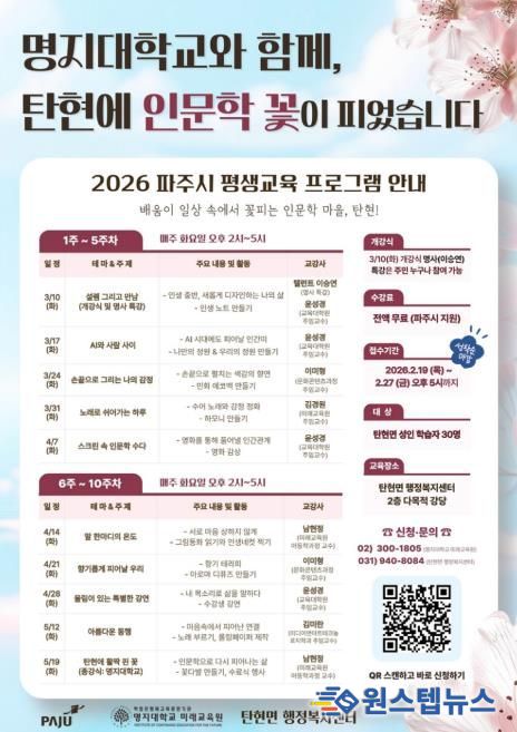 이태희 탄현면장은 “이번 평생학습 프로그램은 주민들이 일상 속에서 인문학을 접하고 서로 소통하며 성장하는 소중한 기회가 될 것”이라며 “앞으로도 지역과 대학이 협력해 배움이 이어지는 학습공동체를 만들어 가겠다”라고 밝혔다.