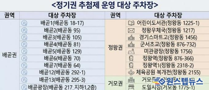 이번 추첨 대상 공영주차장은 배곧권의 배곧1~7호, 배곧12~13호, 배곧광장 10개소와 정왕권의 어린이도서관, 정왕우체국, 경기스마트고, 군서초교, 미관광장, 정왕역, 정왕역1, 체육공원 복개천 8개소, 거모권의 거모중앙, 도일시장 주차장 2개소를 포함하여 총 20개소다.