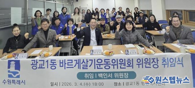 신임 백인서 광교1동 바르게살기운동위원회 위원장은 “지역사회와 적극 소통하며 주민 화합과 기초질서 확립을 위해 앞장서겠다. 따뜻하고 안전한 광교1동을 만드는 데 최선을 다하겠다”고 밝혔다.
