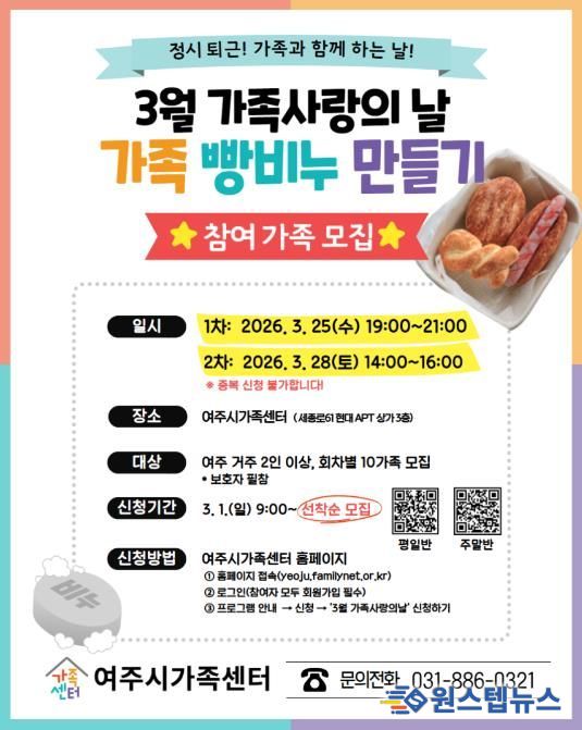 “가족사랑의 날”은 여주시 거주 가족을 대상으로 3월부터 11월까지 매월 2회기씩 운영된다. ▲ 3월: 가족 빵비누 만들기 ▲ 4월: 미니 도넛 만들기 ▲ 5월: 나들이 도시락 만들기 ▲ 6월: 공간 향수 만들기 등 온 가족이 함께 즐길 수 있는 체험형 활동으로 구성된다. 특히 4월5월8월에는 센터 방문이 어려운 원거리 거주 가족을 위해 ‘찾아가는 가족사랑의날’을 병행하여 운영의 폭을 넓혔다. 참여 신청은 매월 1일부터 여주시가족센터 홈페이지를 통해 선착순으로 모집한다.