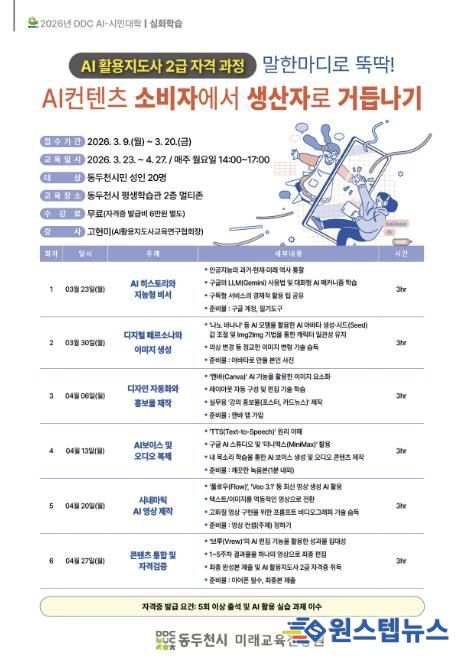 원스텝뉴스 이병희 기자 | 동두천시는 다가오는 인공지능(AI) 시대에 발맞춰 시민들의 디지털 미래 역량을 강화하기 위해 ‘2026년 DDC AI-시민대학’을 개최하고, 오는 3월 9일부터 수강생을 모집한다고 밝혔다.