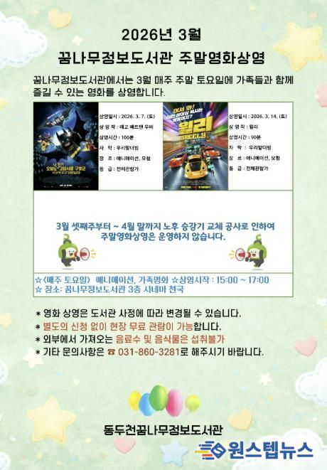 이번에 상영될 영화로는 ‘레고 배트맨 무비’와 ‘윌리’가 편성됐다. 관람료는 무료이며, 매주 토요일 오후 3시, 3층 시네마천국에서 선착순으로 입장해 누구나 자유롭게 관람할 수 있다.