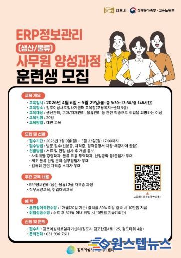 원스텝뉴스 이병희 기자 | 김포여성새로일하기센터는 지역 산업 수요에 부합하는 전문 인력 양성과 경력보유 여성의 안정적인 취업 지원을 위해 '전사적 자원관리(ERP) 생산·물류 사무원 양성 과정' 훈련생을 모집한다.