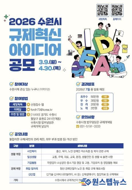 원스텝뉴스 이병희 기자 | 수원특례시가 9일부터 4월 30일까지 ‘2026 규제혁신 아이디어’를 공모한다.
