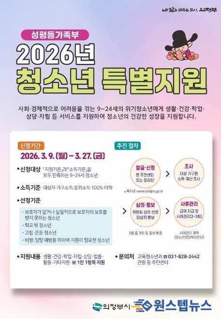 원스텝뉴스 이병희 기자 | 의정부시는 3월 9일부터 27일까지 ‘2026년 청소년 특별지원’ 사업 대상자를 모집한다.