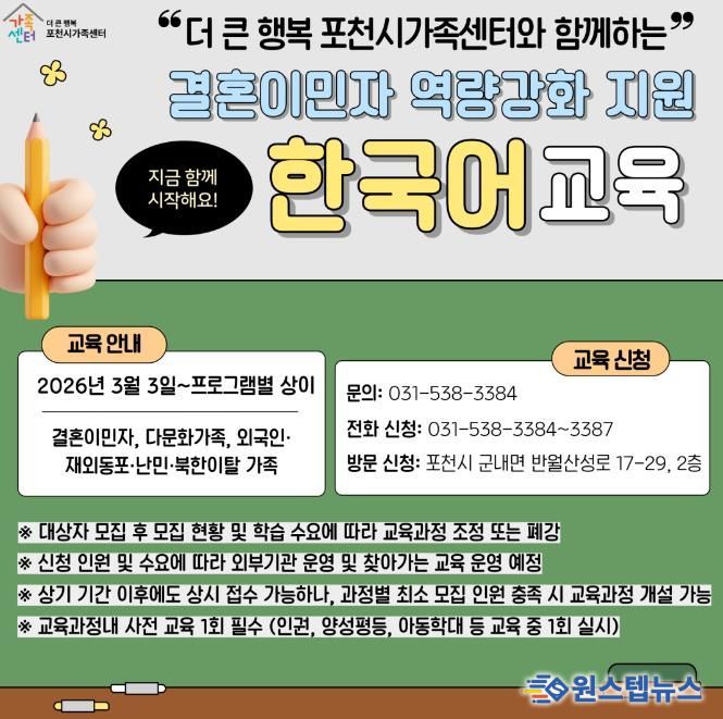 원스텝뉴스 이병희 기자 | 포천시 더 큰 행복 포천시가족센터는 2026년 결혼이민자 역량강화 지원 사업의 일환으로 한국어교육 과정을 수준별, 단계별 체계로 확대 개편하고 본격적인 운영에 들어갔다.