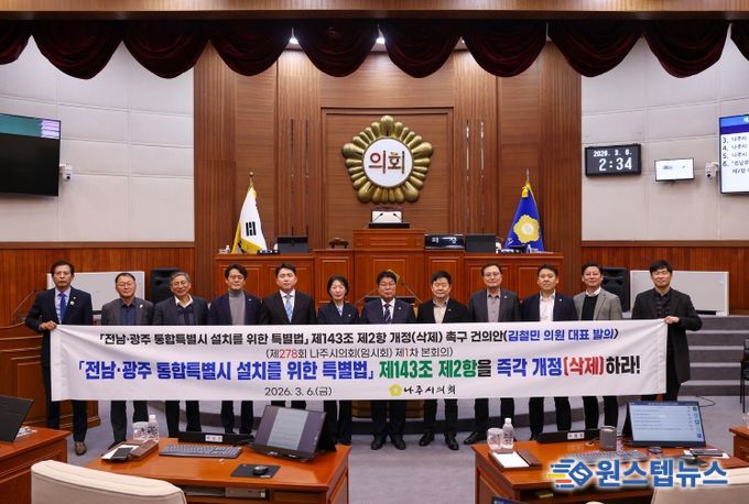 원스텝뉴스 이병희 기자 | 나주시의회는 3월 6일 제278회 임시회 제1차 본회의를 열고 ''전남광주통합특별시 설치를 위한 특별법' 제143조 제2항 삭제 촉구 건의안'을 채택했다.