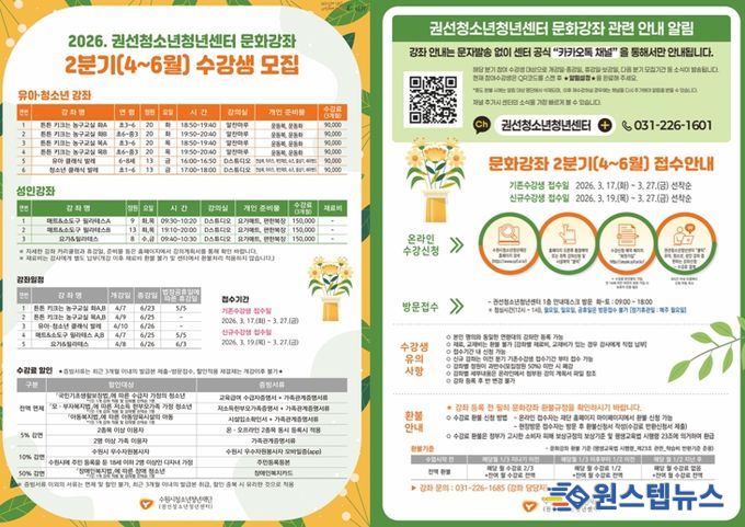 원스텝뉴스 천규영 기자 | 수원시청소년청년재단 권선청소년청년센터는 오는 3월 17일부터 3월 27일까지 지역사회 평생학습 문화강좌 2분기(4~6월) 수강생을 모집한다.