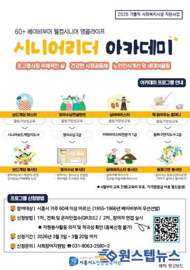 원스텝뉴스 이병희 기자 | 시흥시노인종합복지관은 천주교수원교구의 지원을 받아 베이비부머 세대를 위한 전문자격 양성과정 ‘시니어리더 아카데미’를 오는 4월부터 운영하는 가운데, 참가 어르신을 모집한다.
