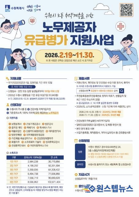 수원시는 11월 30일까지 ‘2026년 노동취약계층 노무 제공자 유급병가 지원사업’ 신청을 받는다.