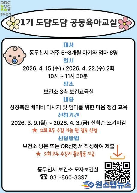 원스텝뉴스 이병희 기자 | 동두천시보건소는 관내 5~8개월 아기와 엄마를 대상으로 상호작용 증진과 양육 역량 강화를 위해“도담도담 공동육아교실”을 운영한다고 밝혔다.