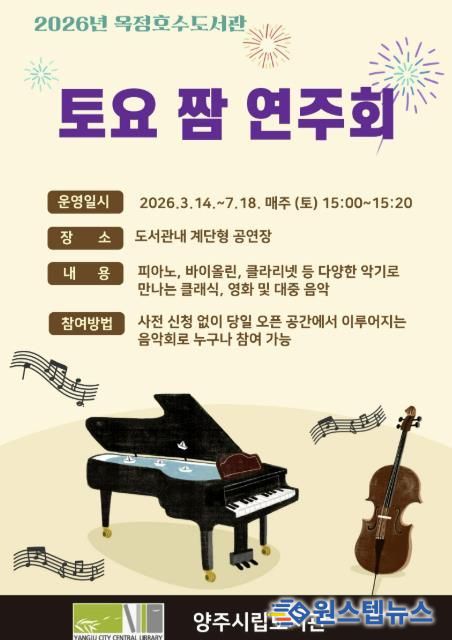 원스텝뉴스 천규영 기자 | 양주시 옥정호수도서관이 오는 3월 14일부터 7월 18일까지 시민들이 일상 속에서 음악을 즐길 수 있도록 ‘토요 짬 연주회’를 진행한다.