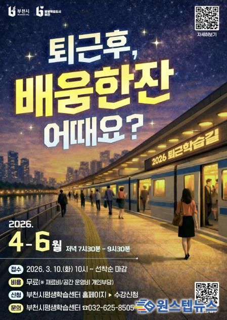 원스텝뉴스 이병희 기자 | 부천시는 3월 10일부터 27일까지 평일 주간 시간 학습이 어려운 시민을 위한 ‘2026년 상반기 퇴근학습길 프로그램’의 학습자를 선착순 모집한다.