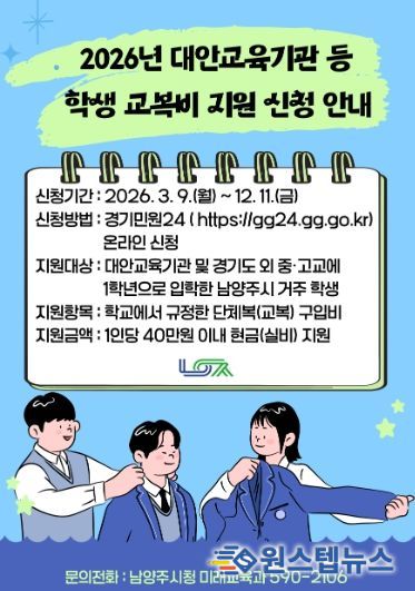 원스텝뉴스 이병희 기자 | 남양주시는 대안교육기관 및 경기도 외 지역 중·고등학교에 입학하는 1학년 학생을 대상으로 교복비 지원사업을 추진한다고 9일 밝혔다.