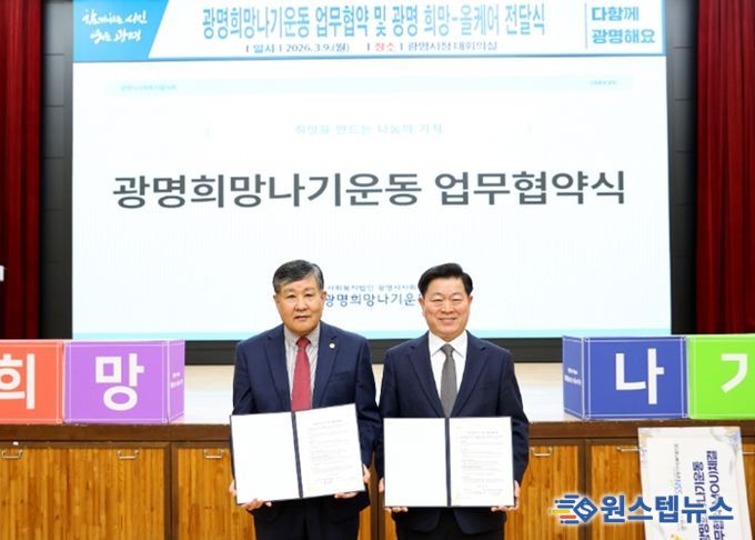 시는 9일 시청 대회의실에서 광명시사회복지협의회와 ‘광명희망나기운동사업’ 업무협약을 체결하고 민관 협력 복지사업을 이어가기로 했다.