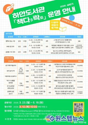 원스텝뉴스 천규영 기자 | 광명시 하안도서관은 상반기 정기 독서문화 프로그램 ‘책다(多)락(樂)’ 수강생을 오는 12일부터 모집한다.