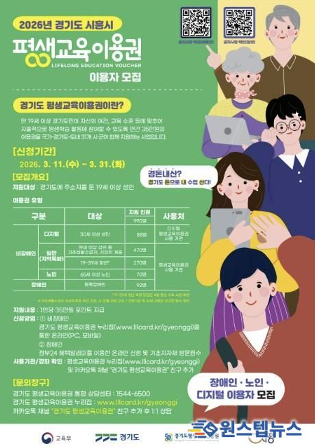 원스텝뉴스 이병희 기자 | 시흥시는 시민들의 평생학습 기회를 확대하기 위해 ‘2026년 제1차 경기도 평생교육이용권’ 신청을 오는 3월 11일 오전 10시부터 3월 31일 오후 6시까지 받는다.