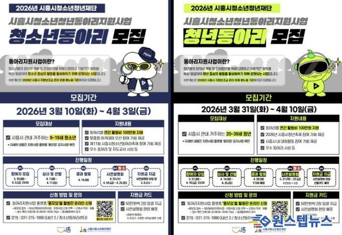 원스텝뉴스 이병희 기자 | 시흥시와 시흥시청소년청년재단은 지역 청소년과 청년의 자율적인 동아리 활동을 지원하고 건강한 문화 형성을 위해 ‘2026년 시흥시 청소년ㆍ청년 동아리 지원사업’에 참여할 동아리 670개를 모집한다고 밝혔다.