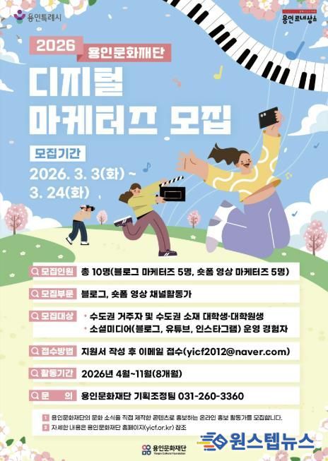 원스텝뉴스 이병희 기자 | 용인문화재단은 오는 3월 24일까지 재단의 다양한 문화·예술사업을 시민의 시선으로 홍보하기 위한 ‘2026 용인문화재단 디지털 마케터즈’를 모집한다고 밝혔다.