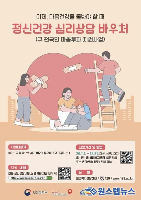 정신건강 심리 상담 바우처 서비스는 우울, 불안, 스트레스 등 정서적 어려움을 겪는 군민에게 전문 심리 상담 서비스를 제공해 정신건강 회복을 돕는 사업이다. 대상자로 선정되면 일부 본인 부담금을 내고 전문 상담 서비스를 이용할 수 있다.