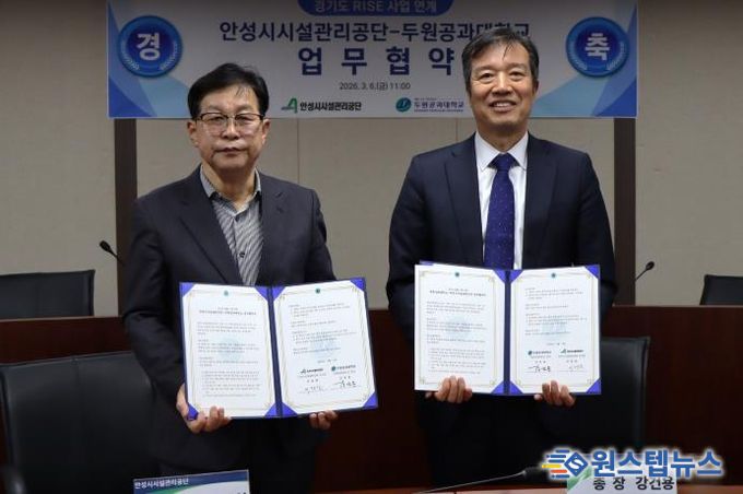 원스텝뉴스 이병희 기자 | 안성시시설관리공단은 두원공과대학교와 지난 6일 금요일 11시 두원공과대학교 안성캠퍼스 철산학술정보관 5층 영상회의실에서 경기도 지역혁신중심 대학지원체계(RISE)사업과 연계한 ‘지역상생 및 주차시설 운영 전문성 강화’를 위한 업무협약을 체결했다고 밝혔다.