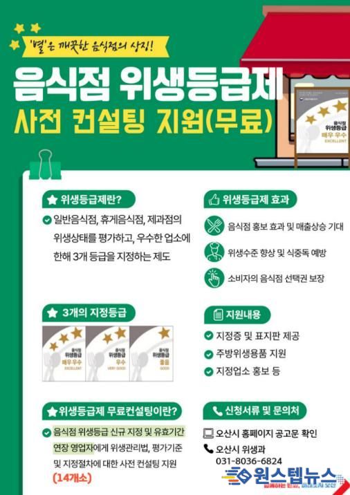 원스텝뉴스 이병희 기자 | 오산시는 관내 음식점의 위생 수준 향상과 안전한 외식환경 조성을 위해 ‘음식점 위생등급제(식품안심업소) 사전 컨설팅’ 참여 업소를 모집한다고 10일 밝혔다.
