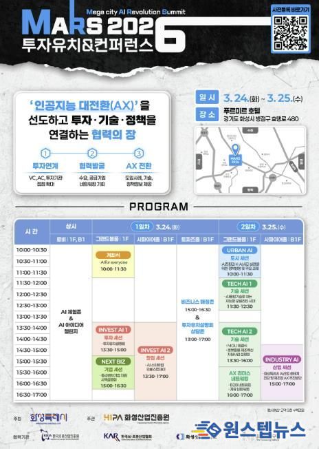 원스텝뉴스 천규영 기자 | 화성특례시가 오는 3월 24일부터 25일까지 이틀간 푸르미르 호텔에서 'MARS 2026 투자유치 & 컨퍼런스'를 개최한다.