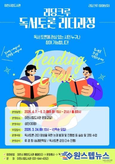 리딩크루의 첫 프로그램으로 ‘독서토론 리더 과정’이 오는 3월 24일부터 참여자를 모집한다. 이 과정은 독서동아리 활동을 이끌 수 있는 시민 독서토론 리더를 양성하기 위한 프로그램이다. 교육은 4월 7일부터 6월 2일까지 매주 화요일 오후 7시, 총 8회 과정으로 운영된다. 모집 인원은 30명이며 이천시 통합도서관 누리집에서 선착순으로 접수한다.