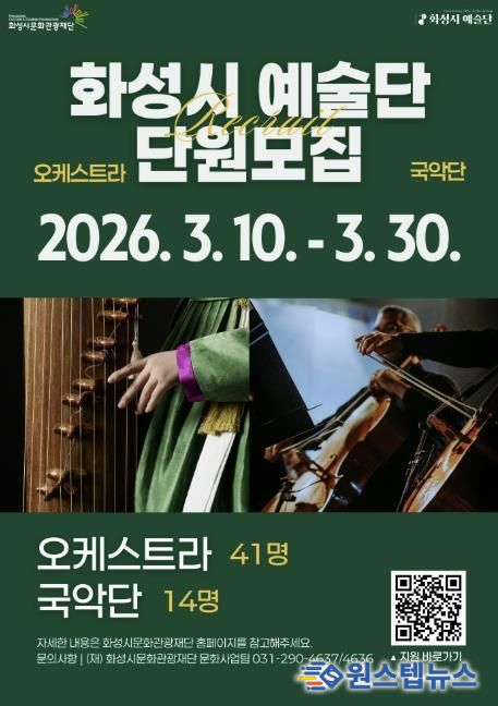 원스텝뉴스 이병희 기자 | 화성시문화관광재단은 2026년 ‘화성시 예술단’을 이끌어갈 오케스트라 및 국악단 단원을 모집한다.