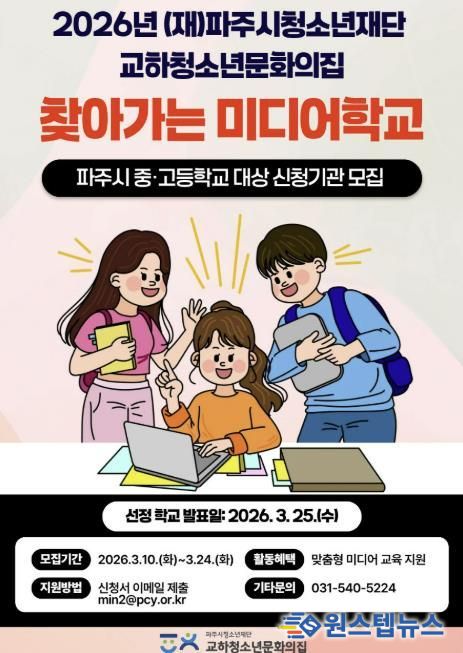 원스텝뉴스 이병희 기자 | (재)파주시청소년재단 교하청소년문화의집은 파주시 청소년의 미디어 이해력 향상과 디지털 역량 강화를 위해 ‘2026년 찾아가는 미디어학교’ 프로그램에 참여할 중·고등학교를 모집한다고 밝혔다.
