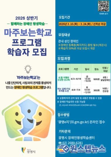 원스텝뉴스 이병희 기자 | 광명시 평생학습원은 장애인 학습자의 자기 이해와 사회 참여 역량 강화를 위한 평생학습 프로그램 ‘마주보는학교’의 상반기 수강생을 오는 24일까지 모집한다.
