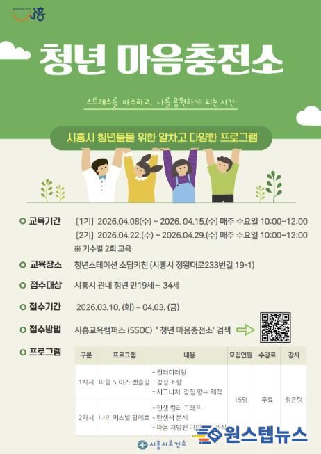 원스텝뉴스 이병희 기자 | 시흥시보건소는 청년들의 정서적 안정과 심리적 회복력 강화를 위해 오는 4월 청년스테이션에서 마음 치유 프로그램 ‘청년 마음충전소’를 운영하는 가운데 오는 4월 3일까지 참가 청년을 모집한다.