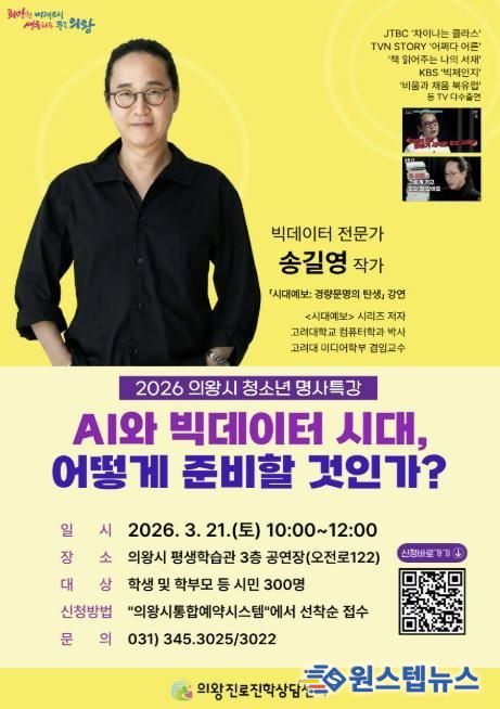 원스텝뉴스 이병희 기자 | 의왕시 진로진학상담센터가 3월 21일 오전 10시, 의왕시 평생학습관(오전로 122)에서 청소년과 시민을 대상으로 '2026 상반기 청소년 명사특강'을 개최한다.