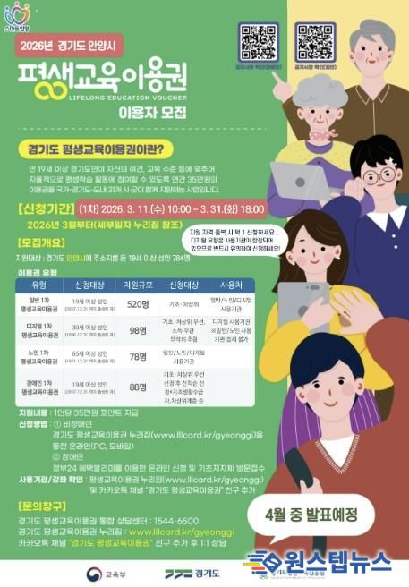 원스텝뉴스 이병희 기자 | 안양시는 저소득층, 어르신, 장애인 등 교육 취약계층의 평생학습 기회를 보장하기 위한 총 3억 원 규모의 ‘2026년 평생교육 이용권(바우처) 지원사업’을 추진한다고 11일 밝혔다.