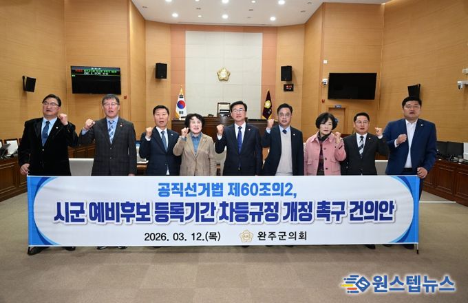 원스텝뉴스 이병희 기자 | 완주군의회는 12일 열린 제299회 임시회 제2차 본회의에서 심부건 의원이 대표 발의한 ‘공직선거법 제60조의2 시·군 예비후보 등록기간 차등 규정 개정 촉구 건의안’을 만장일치로 채택했다.