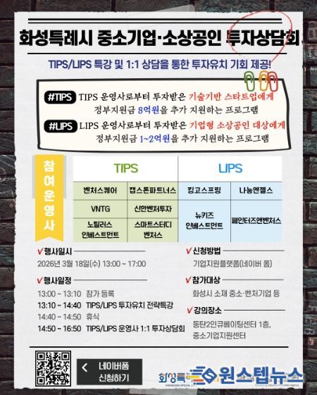 ‘화성특례시 중소기업·소상공인 투자상담회’는 화성시 중소기업 및 소상공인의 투자유치 역량 강화를 지원하기 위해 마련됐으며, TIPS(Tech Incubator Program for Startup) 및 LIPS(Licorn Incubator Program for Small brand) 프로그램을 중심으로 운영된다.