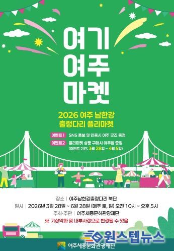 원스텝뉴스 이병희 기자 | 여주세종문화관광재단은 오는 3월 28일부터 6월 28일까지, 여주 남한강 출렁다리 북단 일원에서 플리마켓 ‘여기 여주 마켓’을 진행한다고 밝혔다.