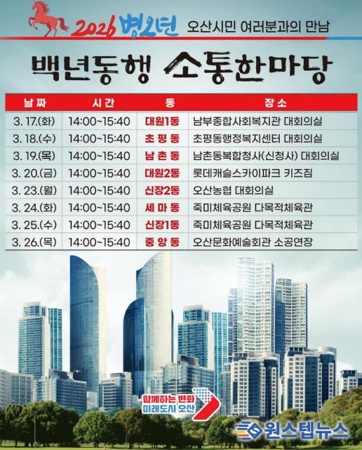 원스텝뉴스 천규영 기자 | 오산시가 시민과 직접 만나 시정 운영 방향을 공유하고 지역 현안을 듣는 ‘2026 백년동행 소통한마당’을 개최한다.