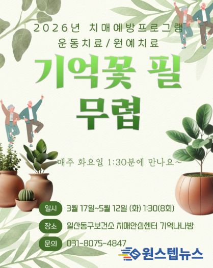 원스텝뉴스 이병희 기자 | 고양특례시 일산동구보건소 치매안심센터는 지역 어르신들의 인지기능 향상과 정서적 안정을 위해 원예활동과 신체활동을 결합한 치매예방 프로그램 ‘기억꽃 필 무렵’ 참가자를 모집한다.