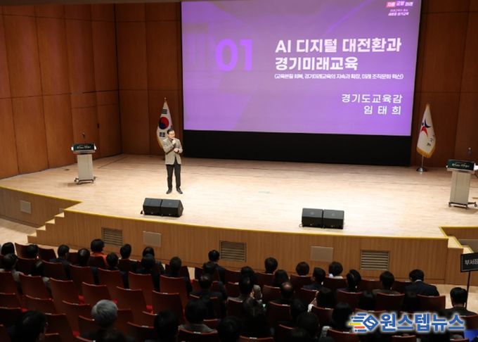 주요 순서는 ▲인공지능(AI) 디지털 대전환과 경기미래교육 주제 발표(교육의 본질회복, 경기미래교육의 지속과 확장, 미래조직문화 혁신) ▲인공지능(AI) 전환 시대에 따른 교육정책 방향 제시 ▲경기교육 디지털 플랫폼 ‘지원이(G-ONE)’ 안내 등으로 진행했다.