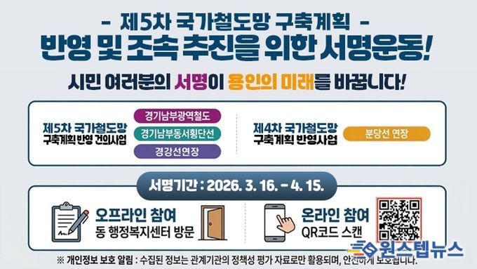 원스텝뉴스 이병희 기자 | 용인특례시는 16일부터 4월 15일까지 한 달간 용인시민과 국민 전체를 대상으로 ‘제5차 국가철도망 구축계획 반영 및 조속 추진을 위한 서명운동’을 펼친다고 15일 밝혔다.