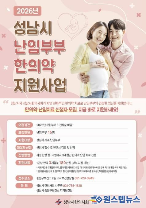 원스텝뉴스 이병희 기자 | 성남시는 난임부부를 위한 한의약 지원사업을 시행한다고 17일 밝혔다.