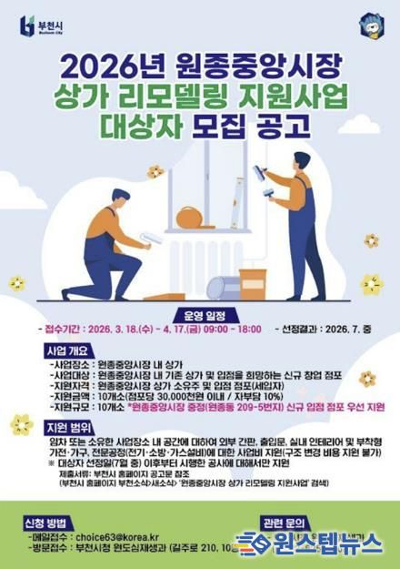 원스텝뉴스 이병희 기자 | 부천시는 3월 18일부터 4월 17일까지 ‘원종중앙시장 상가 리모델링 지원사업’ 대상자를 모집한다.